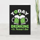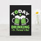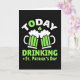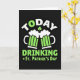 This card features a deep black background with the word “TODAY” set large at the top in white, except for a lime-green “O” that grabs your attention 💚. Beneath it, two stylized beer mugs tilt toward each other as if sharing a friendly, close-in toast, their rims touching like a small moment of togetherness. The mugs are outlined in white, filled with bright green beer, and topped with thick white foam that spills up in rounded shapes. A small three-leaf shamrock sits tucked between the upper curves of the mugs, like a little lucky accent ☘️. The word “DRINKING” appears below in green, centered and spaced to echo the strong, simple layout above. Under that, “*ST. PATRICK’S DAY” is also in green, lined up beneath “DRINKING” to complete the stacked message. The whole design stays flat and graphic, with high contrast between the black field, the white outlines, and the green type and beer. The mugs’ handles curve outward in white, with the clink point centered under the lime-green “O.”