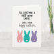 This card features a cheeky Easter message centered on a bright white background, mixing flirty humor with a quick, bashful correction 🐰. The top line sits in large, dark lettering and reads “I’LL GIVE YOU A PEEP SHOW LATER,” giving the page a daring, teasing start. Just below it, a smaller all-caps “SORRY, I MEAN,” appears like a sudden pause, as if the writer caught themselves mid-thought. Under that, “happy easter” is written in a looser, flowing style, softening the tone like a gentle smile shared between friends. The stacked text stays neatly centered, leaving plenty of open space that makes the joke feel even more pointed. Beneath the words are three simple bunny shapes 🐇 in pastel pink, teal, and lavender, adding a sweet counterbalance to the saucy line above. Each bunny is turned away, which makes the scene feel a bit coy, like they’re in on the joke together. A tiny white circle sits at the base of each bunny as a fluffy tail against the colored silhouettes.