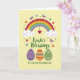 This card shows a softly shaded pale yellow background with a rainbow-like arc stretching across the upper area between two light, fluffy clouds 🌷. A small red heart hangs from the top of the arc, like a gentle token being offered to someone special. Just beneath, the words “Easter Blessings” sit centered in medium-to-dark green lettering that feels friendly and springlike. Lower on the card, three decorated egg shapes are lined up side by side, suggesting a shared moment of celebration. The left egg is deep purple with small white dots, the middle egg is orange with wavy blue and red lines, and the right egg is green with white floral patterns 🐰. Tiny flowers in blue, orange, and green, along with a few small winged insects, are scattered around as if they’re drifting between the eggs and the clouds. Along the bottom edge, a smaller line of text reads “For my dear Grandparents” in a darker tone, with the rainbow and dangling heart hovering above.