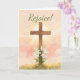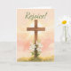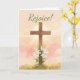 This Easter greeting features a radiant wooden cross illuminated by the rising sun, surrounded by graceful white lilies in a soft spring landscape. The word Rejoice appears boldly above the cross, creating a reverent yet uplifting proclamation of faith. Designed for Christian and Catholic Easter celebrations, this meaningful artwork expresses the joy of the Resurrection with warmth and serenity. A beautiful choice for sharing hope, renewal, and spiritual encouragement during the Easter season.