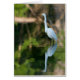 Um Egret Branco Excelente parado num rio raso a perseguir um peixe. O reflexo do pássaro é visto nas águas calmas.