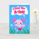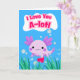 Cartão de saudação para o dia do namorados com um anfíbio axolotl agudo segurando um coração. Eu te amo muito, escrito no cobrir. Dentro mensagem Feliz Dia do Namorados! Arte, imagem e direitos de autor versos © Shoaff Ballanger Studios, 2025.