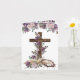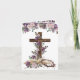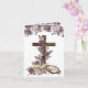 Esta Páscoa apresenta um gráfico de uma cruz adornada com flores roxas com uma Bíblia aberta na base. Há um verso das escrituras na dentro à esquerda. Há rosa e roxo rodado ao longo do topo. O dentro tem uma saudação que diz "Ele é Risen" "Feliz Dia da Ressurreição. Você pode personalizar com seus nomes.
