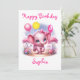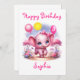 Um elefante rosa adorável está comemorando seu aniversário com balões cor-de-rosa em um belo mundo de fantasia rosa. Personalize com o nome e a idade do seu filho.