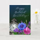 This belated birthday card showcases a classic vintage clock surrounded by vibrant florals in shades of purple, blue, and pink, set against a smooth blue–green gradient background. The bright botanical cluster adds a warm, uplifting touch to the late birthday message, creating a thoughtful and elegant front design.