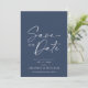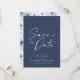 Anuncie seu dia especial com estilo com este Cartão Elegante de Floral Azul para Salvar a Data. Com uma escrita branca sofisticada em um fundo azul-marinho profundo, este cartão exala charme atemporal. O verso apresenta um delicado padrão floral azul, adicionando um toque romântico. Perfeito para casamentos, noivados e celebrações formais, este cartão de Salvar a Data garante que seus convidados marquem suas agendas para o seu evento inesquecível.