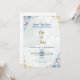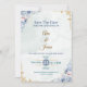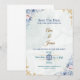 Convide seus convidados a marcar suas agendas com este elegante cartão "Save the Date" com flores em aquarela azul suave, cantos ornamentais dourados e tipografia moderna. Ideal para temas de casamento clássicos ou românticos. Personalize facilmente com seus nomes, data e local.