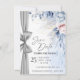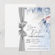 Anuncie seu dia especial com elegância atemporal usando este cartão de Save the Date em aquarela de luxo, lindamente projetado com flores em tons de azul suave e rosa e um sutil detalhe de fita prateada.