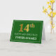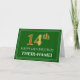 A frente deste elegante e respeitável design de cartão de saudação de aniversário com tema de cumprimentos apresenta um grande número ordinal "14" com uma aparência de inspiração de falsa/imitação de ouro, a mensagem "HAPPY 14 BIRTHDAY", um nome de destinatário personalizado e um padrão de borda que consiste em linhas finas em um fundo de cor verde. O dentro apresenta uma mensagem de saudação de aniversário personalizável, ou talvez possa ser apagado e deixado o vazio se uma mensagem for escrita manualmente. Um cartão de saudação de aniversário personalizável como este poderia ser enviado para celebrar o décimo quarto aniversário de alguém. [~Z0000481]