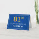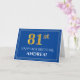 A frente deste respeitável e elegante design de cartão de saudação com tema de aniversário apresenta um grande número ordinal "81ruas", com um olhar inspirou de falsa/imitação de ouro, a mensagem "HAPPY 81RUA BIRTHDAY", um nome de destinatário editável, e um padrão de borda que consiste em linhas finas sobre um fundo de cor azul. O dentro apresenta uma mensagem de saudação de aniversário personalizada, ou talvez possa ser apagado e deixado o vazio se uma mensagem for escrita manualmente. Um cartão de saudação de aniversário editável como este poderia ser enviado para celebrar o oitenta e um aniversário de alguém. [~Z0000482]