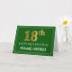 A frente deste respeitável e elegante design de cartões de saudação de aniversário apresenta um grande número ordinal "18º" com uma aparência inspirada em imitação/falsa ouro, a mensagem "FELIZ 18º ANIVERSÁRIO", um nome de destinatário personalizável e um padrão de borda que consiste em linhas finas sobre um fundo de cor verde. O dentro apresenta uma mensagem de saudação de aniversário personalizada, ou talvez possa ser apagado e deixado o vazio se uma mensagem for escrita manualmente. Um cartão de saudação de aniversário personalizável como este pode ser uma maneira elegante de enviar uma mensagem de saudação de aniversário a alguém que está celebrando seu décimo oitavo aniversário. [~Z0000481]