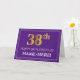A frente deste rico e design de cartão de saudação com tema de aniversário luxuoso apresenta um grande número ordinal "38º", com um aspecto de inspiração falsa/imitação de ouro, a mensagem "FELIZ 38º ANIVERSÁRIO", um nome de destinatário personalizado e um padrão de borda que consiste em linhas finas, sobre um fundo de cor púrpura. O dentro apresenta uma mensagem de saudação de aniversário personalizada, ou talvez possa ser apagado e deixado vazio se uma mensagem for escrita manualmente. Um cartão de saudação de aniversário personalizável como este pode ser enviado para celebrar o trinta e oitavo aniversário de alguém. [~Z0000484]