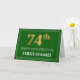 A frente deste design de cartão de saudação de aniversário luxuoso e rico apresenta um grande número ordinal "74.º" com uma aparência inspirada em imitação/falsa ouro, a mensagem "FELIZ 74.º ANIVERSÁRIO", um nome de destinatário personalizável e um padrão de borda que consiste em linhas finas sobre um fundo de cor verde. O dentro apresenta uma mensagem de saudação de aniversário personalizável, ou talvez possa ser apagado e deixado o vazio se uma mensagem for escrita manualmente. Um cartão de cumprimentos de aniversário personalizado como este pode ser uma maneira elegante de enviar cartões de aniversários a alguém que comemora seu setenta e quarto aniversário. [~Z0000481]