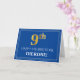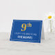 A frente deste rico e elegante design de cartão de saudação com tema de aniversário apresenta um grande número ordinal "9º", com um aspecto falsa/imitação de ouro inspirado, a mensagem "FELIZ 9º ANIVERSÁRIO", um nome de destinatário personalizado e um padrão de borda que consiste em linhas finas num fundo azul colorido. O dentro apresenta uma mensagem de saudação de aniversário personalizável, ou talvez possa ser apagado e deixado o vazio se uma mensagem for escrita manualmente. Um cartão de saudação de aniversário personalizado como este pode ser enviado para celebrar o nono aniversário de alguém. [~Z0000482]