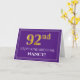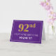 A frente deste design de cartão de saudação de aniversário elegante e rico de aniversário apresenta um grande número ordinal "92º", com um aspecto de inspiração falsa/imitação de ouro, a mensagem "FELIZ 92º ANIVERSÁRIO", um nome de destinatário personalizável, e um padrão de borda que consiste em linhas finas, sobre um fundo de cor roxa. O dentro apresenta uma mensagem de saudação de aniversário personalizada, ou talvez possa ser apagado e deixado vazio se uma mensagem for escrita manualmente. Um cartão de saudação de aniversário personalizado como este pode ser enviado para celebrar o aniversário de 90 segundos de alguém. [~Z0000484]