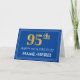 A frente deste respeitável e luxuoso design de cartão de saudação de aniversário com tema de cumprimentos apresenta um grande número ordinal "95", com um olhar inspirado em imitação/falsa ouro, a mensagem "FELIZ 95° ANIVERSÁRIO", um nome de destinatário personalizável e um padrão de borda que consiste em linhas finas sobre um fundo de cor azul. O dentro apresenta uma mensagem de saudação de aniversário editável, ou talvez pudesse ser apagado e deixado o vazio se uma mensagem fosse escrita manualmente. Um cartão de saudação de aniversário editável como este poderia ser enviado para celebrar o 95º aniversário de alguém. [~Z0000482]