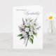 Um cartão de simpatia elegante com ilustração de flores brancas e lilás em um arranjo simples de mão atada. O texto no topo é "Com a mais profunda simpatia" e o cartão é vazio.