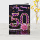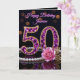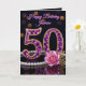 Celebre meio século de brilho cintilante com este cartão de aniversário de 50 anos luxuoso e glamoroso. O design apresenta um deslumbrante número "50" inspirado em joias, incrustado com gemas em estilo ametista roxa e emoldurado em ouro. A composição elegante é acentuada por uma sequência de pérolas clássicas, uma rosa rosa suave e folhas de ouro contra um fundo preto sofisticado com efeitos de iluminação bokeh.