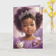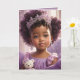 Apresenta uma ilustração encantadora de uma criança afro-americana. Esta adorável menina, com bochechas gorduchas e rosto de bebê, ostenta lindos coques afro fofos, brincos de diamante cintilantes e uma tiara de diamante radiante. Vestida com um lindo vestido de tutu roxo, ela adiciona um toque de elegância e charme a qualquer ocasião. A princesinha querida segura um ursinho de pelúcia fofo, aumentando a inocência e a calidez do design. Perfeito para aniversários ou qualquer celebração elegante para uma menina, este cartão de felicitações captura a magia da infância e a alegria de momentos especiais.