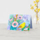 Um cartão de boas-vindas em breve com um pássaro amarelo brilhante empoleirado num galho com um bonito buquê floral com flores cor-de-rosa, laranja e roxo.