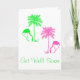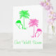 Tema de praia tropical Conheça o cartão de boas-vindas com Flamingos sob Palm Trees em cor rosa-neon e verde limão.
