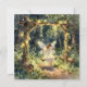 A beautiful fairy tale themed blank notecard. The lovely illustration has a fairy girl swinging on a magical swing in an enchanted garden in the forest. Fairy lights adorn the trees and swing.