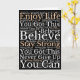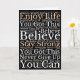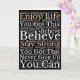 Envie a alguém vibrações positivas encorajadoras com este padrão de Wordart de frases motivacionais inspiracionais como Aproveitar a Vida, Você Pode, Acredite, Ficar Forte, Nunca Desistir, em tipografia branca e marrom em preto, na frente. Dentro, personalize facilmente com sua saudação.