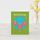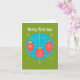 Um cartão de Natal alegre em estilo Mid Century Modern com enfeites pendurados contra um fundo nevado com uma fonte em estilo vintage.
