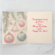 Este cartão de Natal mostra quatro ornamentos lindamente detalhados pendurados em galhos festivos e verdes. Os ornamentos incluem uma decoração cor-de-rosa em forma de sino, um ornamento redondo cor-de-rosa brilhante, um ornamento azul-lacre e outro cor-de-rosa com intrincados padrões florais de ouro e prata. Ao redor dos ornamentos estão reluzentes estrelas de ouro e flocos de neve, acrescentando um toque brilhante e mágico à design. A palavra "Saudações" é escrita em elegante e escrito em ouro no final, melhorando o tema tradicional do feriado do cartão. O fundo tem uma sensação suave e víbora com sotaques como neve, capturando a alegria e a beleza da época de Natal.