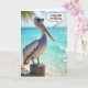 Um óculos de sol pelicano vestindo permanece confiante em uma doca de madeira empilhando pelo mar por um aniversário de 55 anos. Todo o texto pode ser alterado.