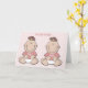 Um desenho cómico das meninas gêmeas que sentam-se de lado a lado com a cópia e a pasta do texto em suas camisas.