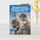 Foto engraçada de dois macacos gostando de martinis pela Hora Feliz. A frente do cartão diz: "Sabe que é velho quando sua ideia de Feliz Hora é..." (acima da foto da hora feliz). Dentro é uma foto de um macaco-cama em um membro da árvore. Continua com...uma soneca.Feliz aniversário! Aproveite o seu "horário da fralda". A alegria de envelhecer!