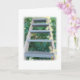 Este cartão fotográfico surreal, branco, apresenta um céu azul e branco-nuvem esparramado em meio à folhagem exterior, com uma corda de luzes ao lado que brilham como vagalumes, e diz, no dentro, "Deu um passo de cada vez, qualquer coisa é possível."