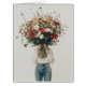 Uma pessoa vestida de jeans casuais e um simples topo branco guarda um enorme buquê de flores silvestres que obscurece completamente o seu rosto. O arranjo grande e colorido de margaridas, papoilas, e outros florins vibrantes contrasta com o fundo e o traje minimalistas, criando um visual impressionante que enfatiza a beleza da natureza. A cena exude uma sensação de capricho e serenidade, à medida que as flores tomam palco central, simbolizando crescimento, vida e simplicidade.
