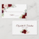 Estes cartões elegantes de escolta são projetados para você escrever no nome do seu convidado e no número da mesa. Eles apresentam um fundo branco clássico com rosas de aquarela pintados manualmente e folhagem em tons de burgundy, vermelho e rosa-pincel. A frente é um espaço de gravação para o nome do seu convidado e o número da mesa, e a parte de trás tem os nomes do casal de casamento em letra de rico junto com a data do casamento.