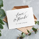 Simples e minimalista trendy moderno cartões de agradecimentos de casamento preto e branco com um roteiro de caligrafia de obrigados e amor com um pouco de coração. +++++++++ Personalize-o com o seu texto e assinatura em ambos os lados! +++++++++ Observe que a cor de fundo pode ser alterada para corresponder ao seu esquema de cor de casamento. Você pode alterá-lo após selecionar a opção PERSONALIZAR TI.