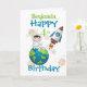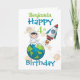 Um cartão de design do Espaço divertido para um quarto aniversário com um astronauta sentado no mundo com um foguete espacial perto e um fundo de planetas e estrelas atiradoras. Um design divertido para aqueles garotos que terão quatro anos. Pode ser personalizado alterando o nome e a idade e depois adicione o seu próprio dentro de mensagem. Um cartão de aniversário para um neto ou sobrinho.