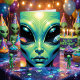 Um cartão de aniversário de outro mundo. Um design cativo de outro mundo com uma alienígena extraterrestre com grandes olhos abaulados segurando as reflexões de outros planetas, incluindo a terra neles.