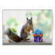 Um esquilo se posiciona entre dois presentes embrulhados intensamente nesta fotografia original.