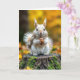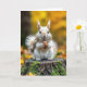 Um esquilo branco esbranquiçado vestindo um cachecol é empoleirado em um toco de árvore coberto de musgo, segurando uma bolota com ambas as patas. O texto é editável.