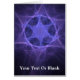 Funcionalidades aninhadas de estrelas roxas de David num fundo escuro. Este mesmo design é oferecido em convites para o Bar/Bat Mitzvah.