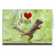 Foto divertida de um esquilo fofo fazendo uma pose de ioga com o texto, "I Heart Yoga" acima dele. O esquilo está no carril de madeira de um pavimento fora, numa posição de ioga com as patas à sua frente, uma perna atrás dele no ar, e o hetero da cauda para fora. Esse esquilo obviamente gosta de fazer exercícios de ioga ao ar livre, cercado pela natureza, com árvores ao fundo. Parece que ele está fazendo sua versão da salusão solar e talvez prestes a entrar na posição de baixo do cachorro. Você pode ter esta linda imagem de esquilo impressa em vários produtos diferentes que podem ser facilmente personalizados. Se você ama ioga, e acha que esquilos são bonitos, esta é a foto para você!