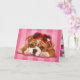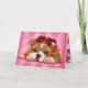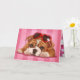 Cachorrinho adorável bulldog inglês com óculos de sol, em fundo listrado de rosa, pintado pela artista Maryline Cazenave.