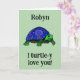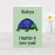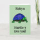 Diga a eles como você se sente com este cartão humorístico. Ele tem um desenho de uma tartaruga fofa e diz: Eu amo você tartarugamente! Você pode personalizá-lo com a escolha do nome na frente e as palavras dentro.