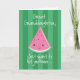 Um cartão tão divertido e "punny" para enviar à sua neta excelente para dizer olá e dizer que está pensando nela! Ela é tão especial que é "uma no melão"! Uma fatia suculenta de melancia rosa está em frente a um fundo verde de duas tonalidades.