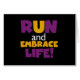 Se você gosta de correr, correr 5Ks, 10Ks, meia maratona, ou maratonas, você vai adorar este design de texto colorido em roxo e amarelo que lê Run and Embrace Life! Corra e Abraça Camisas de Vida, capuzes, ímãs, botões, cartões, adesivos, correntes-chave e muitos outros itens para corredores que adoram um design brilhante e colorido!