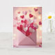 Um envelope cor-de-rosa transborda com corações em papel em vários tons de vermelho, rosa e branco, colocado sobre um fundo suavemente desfocado com luzes brilhantes. O texto pode ser alterado.