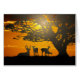 Um pequeno rebanho de veados se acomoda durante a noite sob um enorme carvalho com um sol brilhante atrás deles.