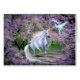 Um unicórnio delicadamente abraçado com lavanda predominância em um fundo de primavera-árvores de cor semelhante e uma celebração de pássaros de fantasia de cartão de reconhecimento primavera