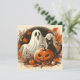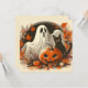 Aqui está uma ilustração de Halloween com aparência retrô de um fantasma com uma jack-o'-lantern e gato preto. Este cartão com aparência retrô mostra o fantasma contra um fundo de folhas em cores de outono. É um cartão fofo com uma aparência retrô e é um ótimo cartão de Halloween e é perfeito para saudações da temporada assustadora, convites ou para acompanhar um presente.